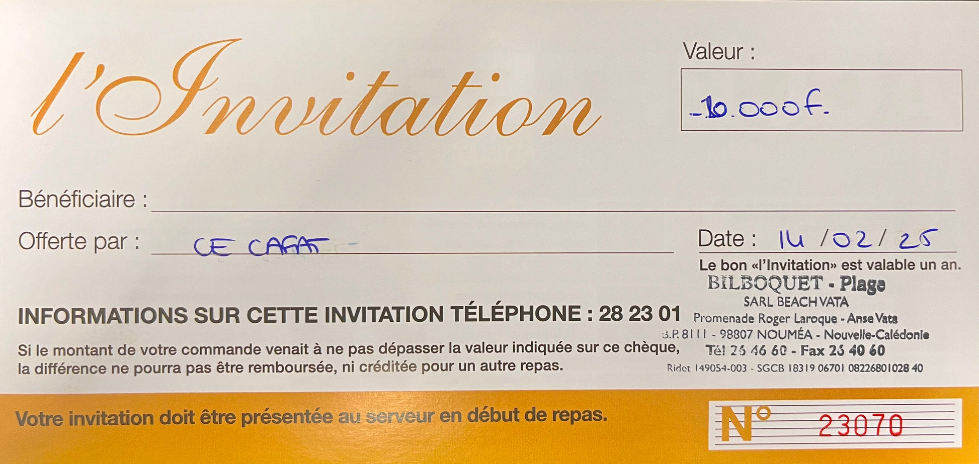 Bon d'une valeur de 10 000 CFP